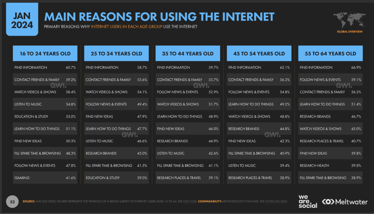 Global research from Datareportal reveals that finding information is the primary reason people use the internet, across all generations.